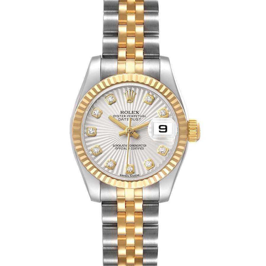 Rolex Datejust Steel Yellow Gold Silver Diamond Ladies Watch 179173. Officially certified chronometer automatic self-winding movement. Stainless steel oyster case 26.0 mm in diameter. Rolex logo on the 18K yellow gold crown. 18k yellow gold fluted bezel. Scratch resistant sapphire crystal with cyclops magnifier. Silver sunburst dial with original Rolex factory diamond hour markers and yellow gold baton hands. Date calendar at the 3 o'clock aperture. Stainless steel and 18k yellow gold jubilee bracelet with a hidden clasp. Fits a 6 1/2" wrist.