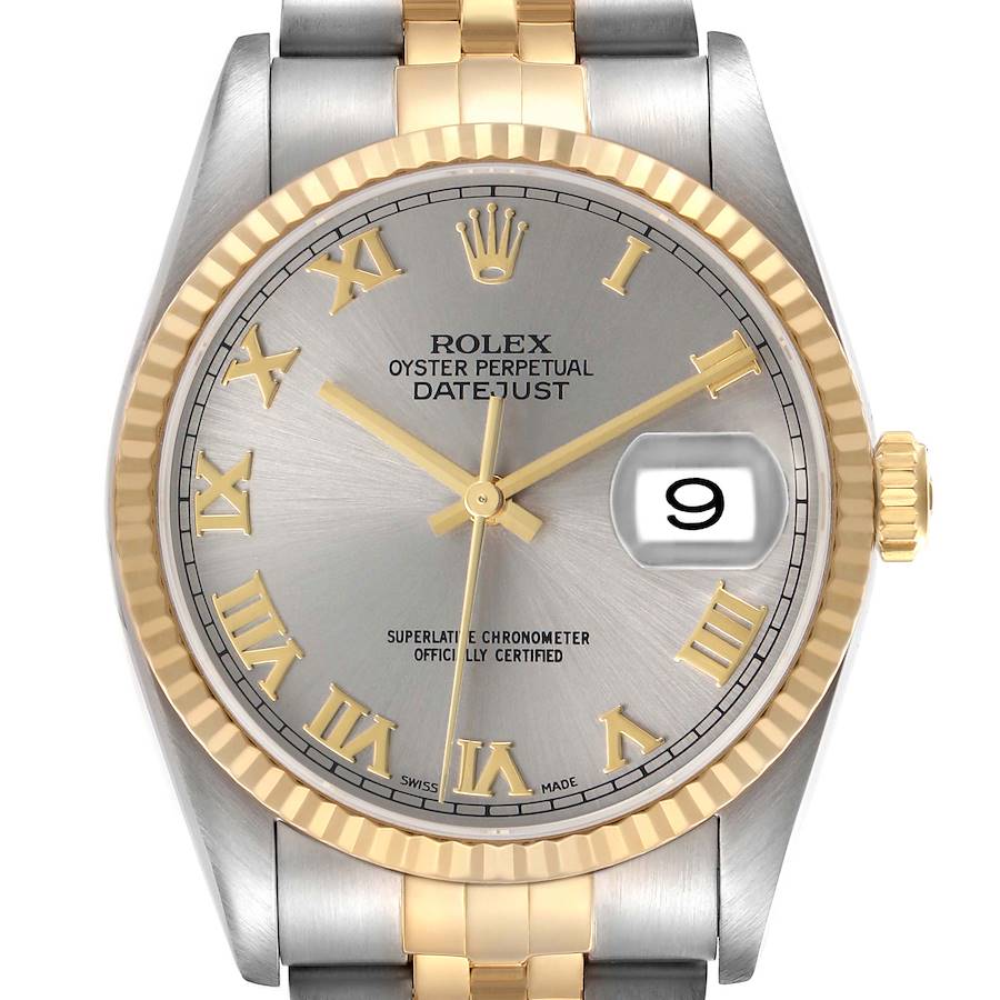 Rolex Datejust Steel Yellow Gold Slate Roman Dial Mens Watch 16233. Officially certified chronometer automatic self-winding movement. Stainless steel oyster case 36.0 mm in diameter. Rolex logo on the 18K yellow gold crown. 18k yellow gold fluted bezel. Scratch resistant sapphire crystal with a cyclops magnifier. Slate grey dial with raised yellow gold Roman numeral hour markers and luminescent yellow gold hands. Date calendar at the 3 o'clock aperture. Stainless steel and 18k yellow gold jubilee bracelet with a fold-over clasp. Fits a 7" wrist.