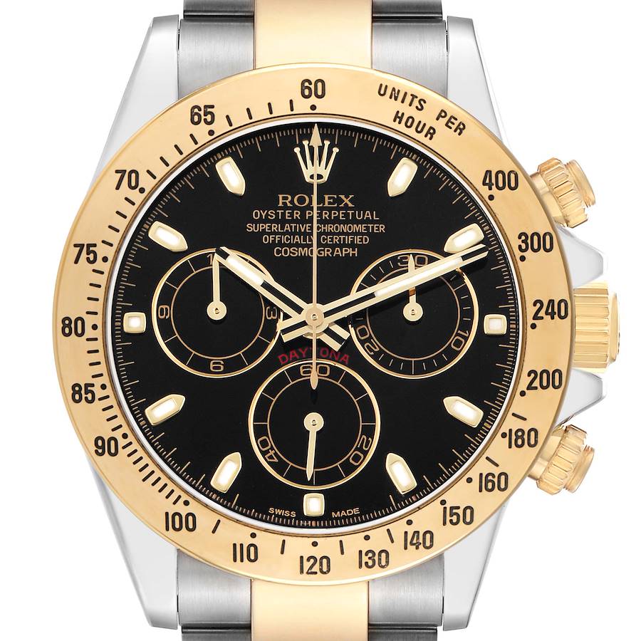 Rolex Daytona Black Dial Steel Yellow Gold Mens Watch 116523 Box Card. Officially certified chronometer automatic self-winding movement. Stainless steel and 18K yellow gold oyster case 40.0 mm in diameter. Special screw-down push buttons. Triplock winding crown protected by the crown guards. Two 18k yellow gold pushers operate the chronograph functions. Rolex logo on the 18k yellow gold crown. 18K yellow gold bezel engraved with the tachymeter scale. Scratch-resistant sapphire crystal. Black dial with luminescent yellow gold baton hour markers and hands. Outer minute and 1/5-second stick markers. Three yellow gold-outlined subdials--running small seconds, 12 hours, and 30-minute chronograph registers. Stainless steel and 18K yellow gold oyster bracelet with a flip-lock clasp. Fits a 7 1/4" wrist.