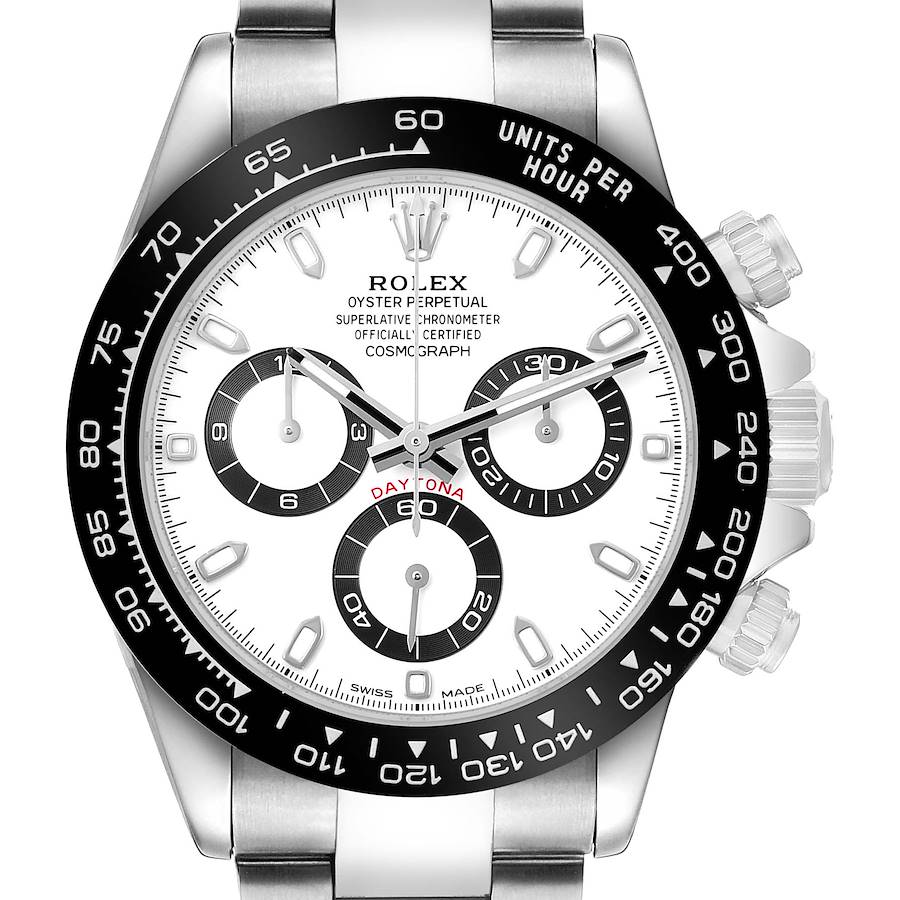 Rolex Daytona Steel Ceramic Bezel White Panda Dial Mens Watch 116500 Box Card. Officially certified chronometer automatic self-winding chronograph movement. Stainless steel oyster case 40.0 mm in diameter. Two screw-down pushers operate the chronograph function. Pointed crown guards. Rolex logo on the crown. Black monobloc Cerachrom ceramic bezel engraved with the tachymeter scale. Scratch resistant sapphire crystal. White "Panda" dial with luminescent baton hour markers and hands. Three black-outlined subdials -- running small seconds, 30-minutes, and 12-hour chronograph registers. Outer minute and 1/5-second stick markers. Stainless steel oyster bracelet with flip-lock clasp and easylink micro-adjustment. Fits a 7 1/2'' wrist.