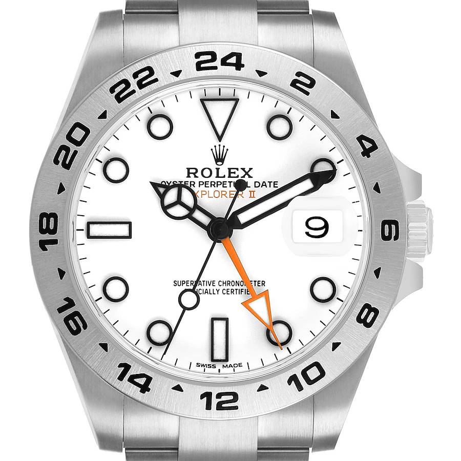 Rolex Explorer II 42 Steel Polar White Dial Mens Watch 216570 Box Card. Officially certified chronometer automatic self-winding movement. Stainless steel oyster case 42.0 mm in diameter. Pointed crown guards. Rolex logo on the crown. Stainless steel bezel engraved with a 24 hour timezone scale. Scratch resistant sapphire crystal with a cyclops magnifier. Polar white dial with luminescent dot hour markers and Mercedes hands. Orange luminescent arrow-tipped second time zone hand. Luminescent lollipop-tipped sweeping seconds hand. Date calendar at the 3 o'clock aperture. Outer stick minute markers. Stainless steel oyster bracelet with a flip-lock clasp. Fits an 7 3/4" wrist.