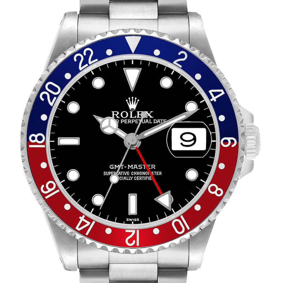Rolex GMT Master Steel Blue Red Pepsi Bezel Mens Watch 16700. Officially certified chronometer self-winding movement. Stainless steel case 40.0 mm in diameter. Rolex logo on a crown. Bidirectional rotating bezel with a special 24-hour blue red "Pepsi" bezel insert. Scratch resistant sapphire crystal. Black dial with white luminescent hour markers and mercedes hands. Date window at 3 o'clock aperture. Stainless steel oyster bracelet with flip lock clasp. Fits a 7 1/4" wrist.