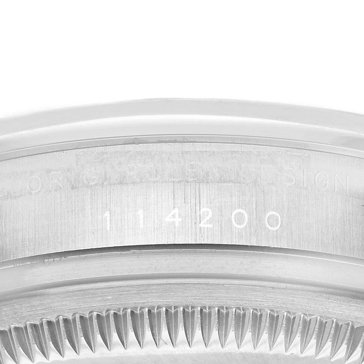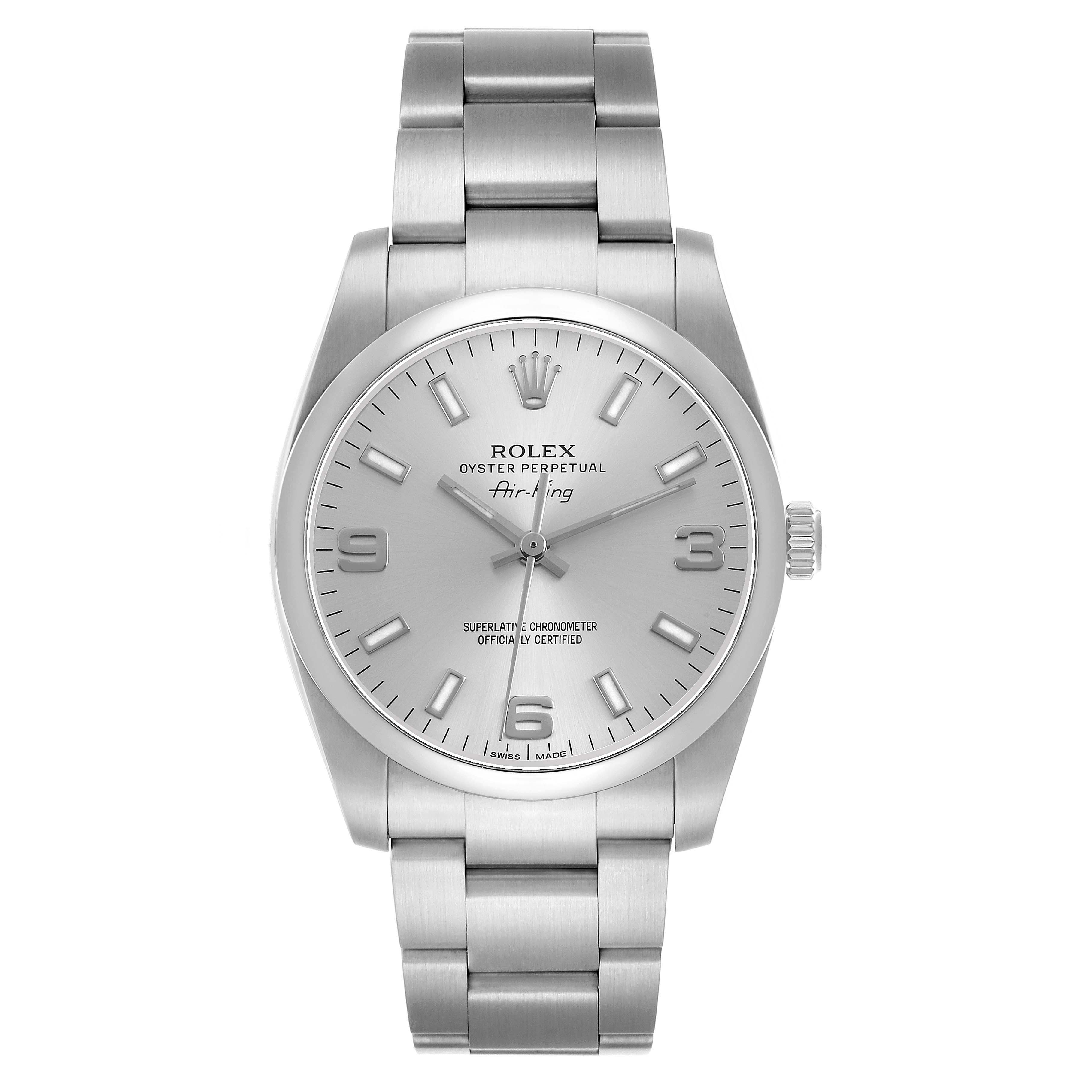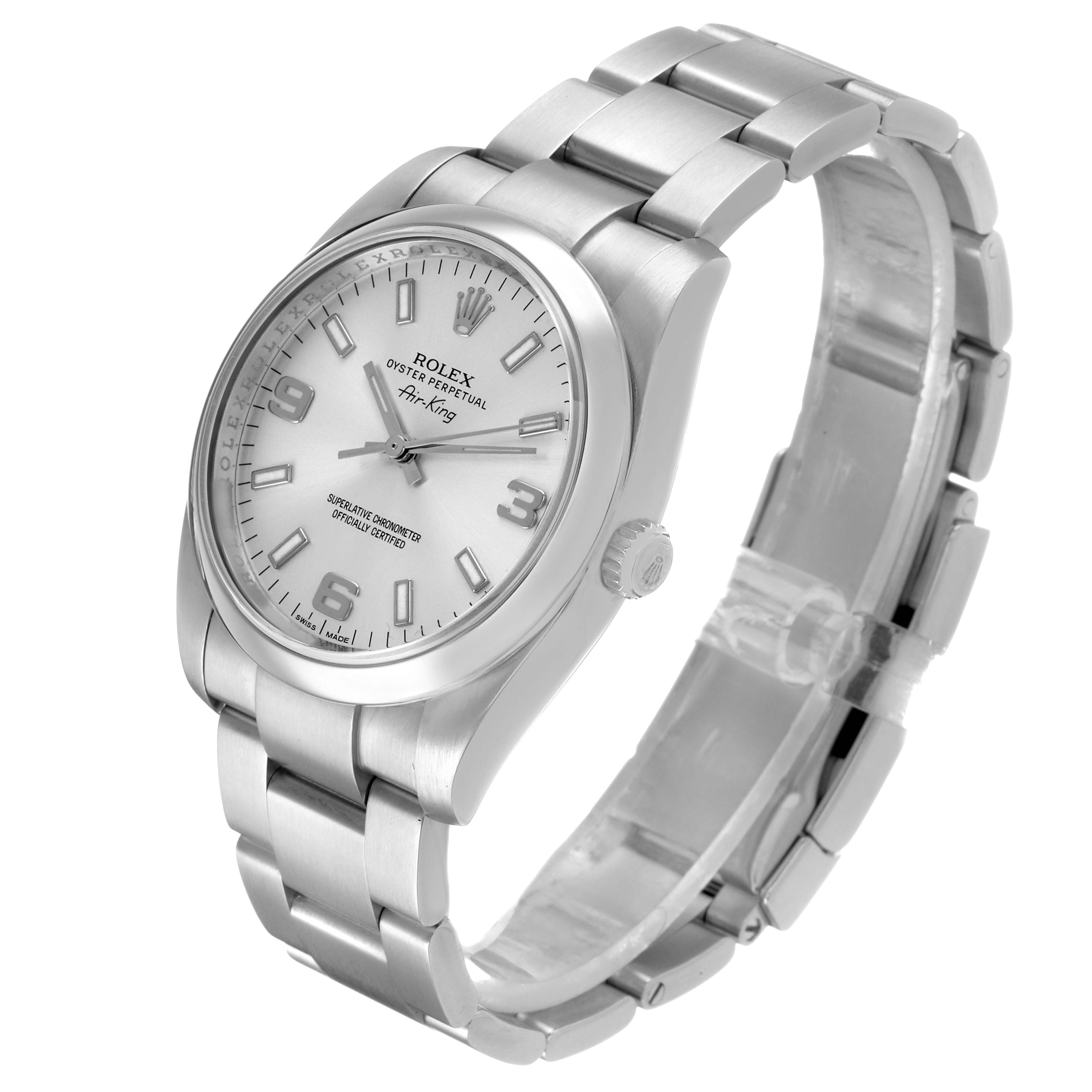 Rolex Oyster Perpetual Air King Silver Dial Steel Mens Watch 114200 Card. Officially certified chronometer self-winding movement. Stainless steel oyster case 34.0 mm in diameter. Rolex logo on the crown. Stainless steel smooth domed bezel. Scratch resistant sapphire crystal. Silver dial with luminescent baton hands and hour markers. Raised Arabic numerals at 3, 6, and 9 o'clock. Stainles steel oyster bracelet with a fold-over clasp. Fits a 7" wrist.