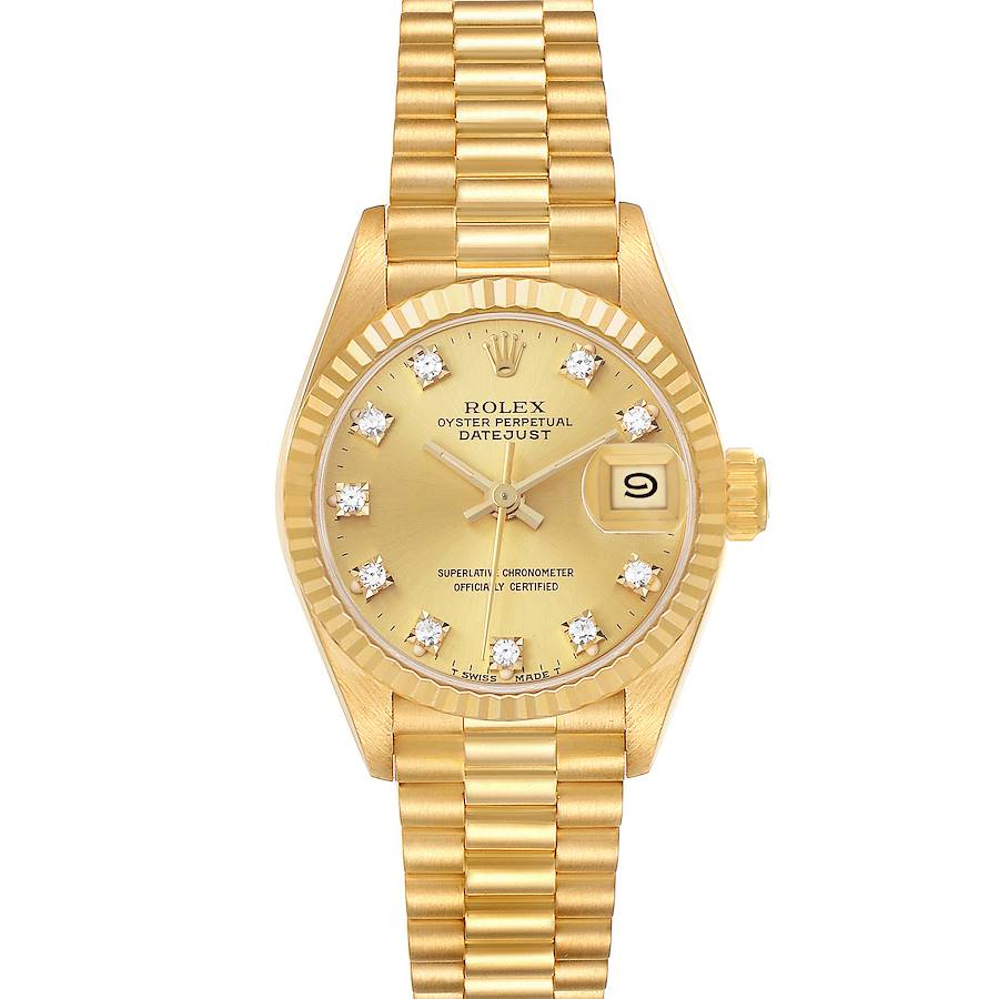 Rolex President Datejust Yellow Gold Diamond Dial Ladies Watch 69178. Officially certified chronometer automatic self-winding movement. 18k yellow gold oyster case 26.0 mm in diameter. Rolex logo on the 18k yellow gold crown. 18k yellow gold fluted bezel. Scratch resistant sapphire crystal with a cyclops magnifier. Champagne dial with original Rolex factory diamond hour markers and yellow gold baton hands. Date calendar at the 3 o'clock aperture. 18k yellow gold president bracelet with a hidden clasp. Fits a 6 1/4" wrist.