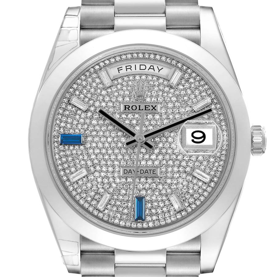 Rolex President Day-Date 40 Diamond Sapphire Platinum Mens Watch 228206 Box Card. Officially certified chronometer self-winding movement. Double quick set function. Platinum oyster case 40.0 mm in diameter. Rolex logo on a crown. Platinum smooth bezel. Scratch resistant sapphire crystal with Cyclops magnifier. Original Rolex factory pave diamond dial with 8 baguette diamond hour markers, 2 baguette sapphire hour markers at 6 and 9 o'clock . Sweep centre seconds. Aperture for day of the week at 12, aperture for date at 3. Platinum presidential bracelet. Fits a 7.5" wrist.