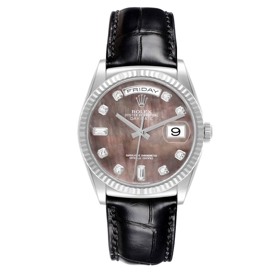 Rolex President Day-Date White Gold MOP Diamond Dial Mens Watch 118139 Box Card. Officially certified chronometer self-winding movement. 18k white gold oyster case 36.0 mm in diameter. Rolex logo on the crown. 18k white gold fluted bezel. Scratch resistant sapphire crystal with a cyclops magnifier. Tahitian mother of pearl dial with original Rolex factory diamond hour markers and baton hands. Sweep centre seconds. Aperture for the weekday at 12, aperture for date at 3. Black leather strap with an 18k white gold deployant clasp.