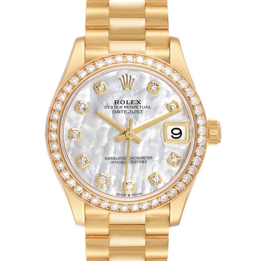 Rolex President Midsize Yellow Gold Mother of Pearl Diamond Ladies Watch 278288. Officially certified chronometer self-winding movement. 18k yellow gold oyster case 31.0 mm in diameter. Rolex logo on a crown. Original Rolex factory diamond bezel. Scratch resistant sapphire crystal with Cyclops magnifier. Mother of pearl dial with original Rolex factory diamond hour markers. Date calendar at 3 o'clock aperture. 18k yellow gold president bracelet with hidden clasp. Fits a 6 1/2" wrist.
