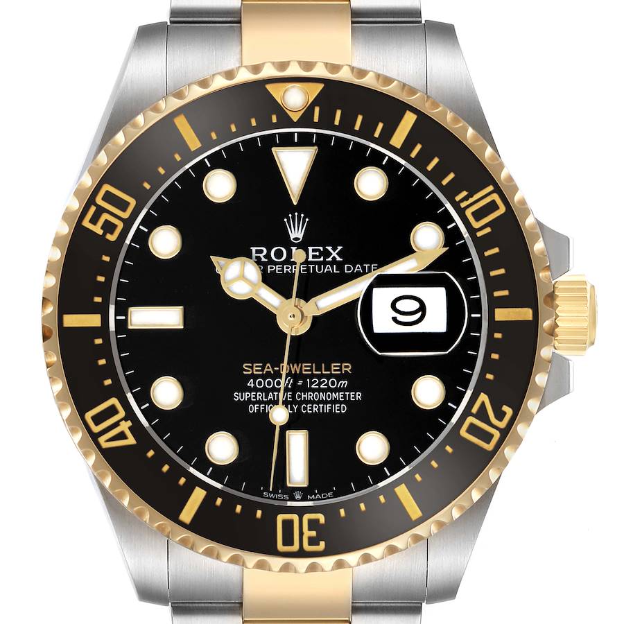 Rolex Seadweller Steel Yellow Gold Black Dial Mens Watch 126603. Officially certified chronometer automatic self-winding movement. Stainless steel and 18K yellow gold oyster case 43.0 mm in diameter. Rolex logo on the 18k yellow gold crown. Pointed crown guards. Special time-lapse unidirectional rotating Cerachrom ceramic black bezel insert with yellow gold Arabic numerals. Scratch resistant sapphire crystal with a cyclops magnifier. Black dial with luminescent Mercedes hands and dot hour markers. Lollipop-tipped sweeping seconds hand. Stick minute markers on outer track. Date calendar at the 3 o'clock aperture. Stainless steel and 18K yellow gold oyster bracelet with a flip-lock clasp. Fits an 8" wrist.