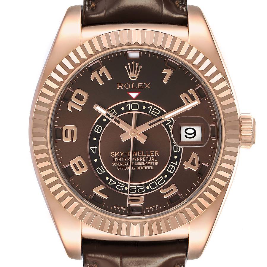 Rolex Sky-Dweller Everose Chocolate Brown Dial Rose Gold Watch 326135 Box Card. Officially certified chronometer self-winding movement. Dual time zones, annual calendar. Paramagnetic blue Parachrom hairspring. High-performance Paraflex shock absorbers. 18K rose gold case 42.0 mm in diameter. Rolex logo on a screw-down twinlock crown. 18K rose gold fluted rotatable ring command bezel. Scratch resistant sapphire crystal with cyclops magnifier. Chocolate brown dial with raised rose gold arabic numerals. Centre hour, minute and seconds hands. 24-hour display on off-centre disc. Second time zone. Instantaneous annual calendar at 3 o'clock and rapid-setting of the date. Month display via 12 apertures around the circumference of the dial. Brown leather strap with the 18K rose gold folding oysterclasp.