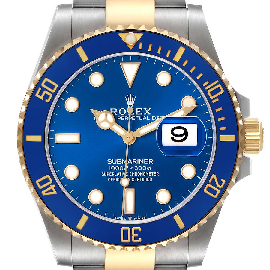Rolex Submariner 41 Steel Yellow Gold Blue Dial Mens Watch 126613 Box Card. Officially certified chronometer automatic self-winding movement. Stainless steel and 18k yellow gold oyster case 41.0 mm in diameter. Pointed crown guards. Rolex logo on the 18k yellow gold crown. Blue ceramic cerachrom unidirectional time-lapse rotating bezel with a 60 minute graduation coated in gold. Scratch resistant sapphire crystal with a cyclops magnifier. Blue dial with luminescent yellow gold dot hour markers and Mercedes hands. Outer stick minute markers. Date calendar at the 3 o'clock aperture. Stainless steel and 18K yellow gold oyster bracelet with a flip-lock clasp. Fits an 8" wrist.