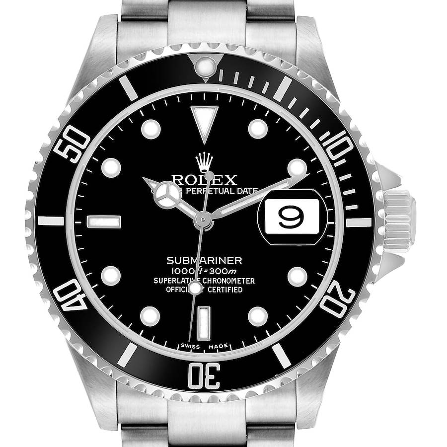 Rolex Submariner Date Steel Black Dial Mens Watch 16610. Officially certified chronometer automatic self-winding movement. Stainless steel oyster case 40.0 mm in diameter. Pointed crown guards. Rolex logo on the crown. Black unidirectional rotating time-lapse bezel engraved with 60-minute graduation. Scratch-resistant sapphire crystal with a cyclops magnifier. Black dial with luminescent Mercedes hands and dot hour markers. Date calendar at the 3 o'clock aperture. Outer stick minute markers. Stainless steel oyster bracelet with a flip-lock clasp. Fits an 8" wrist.