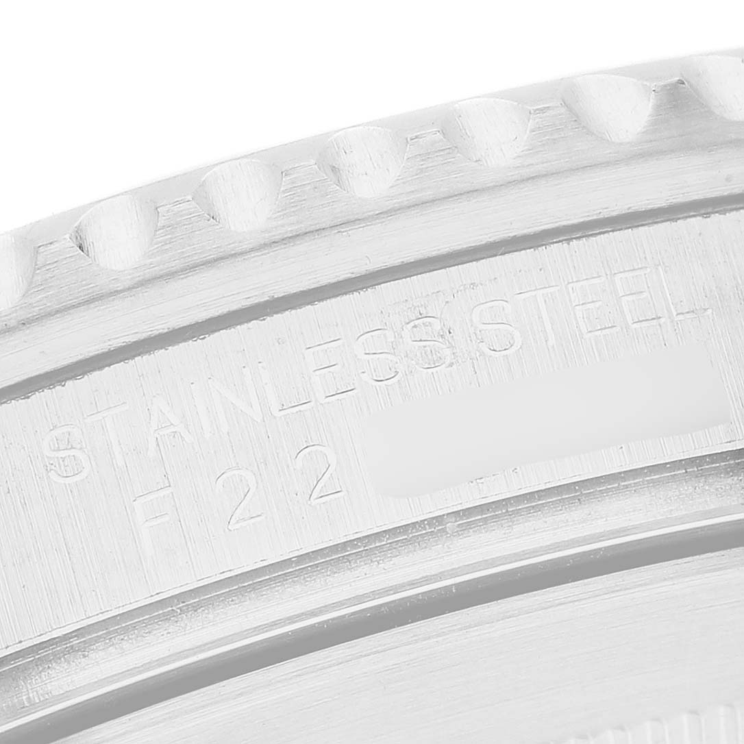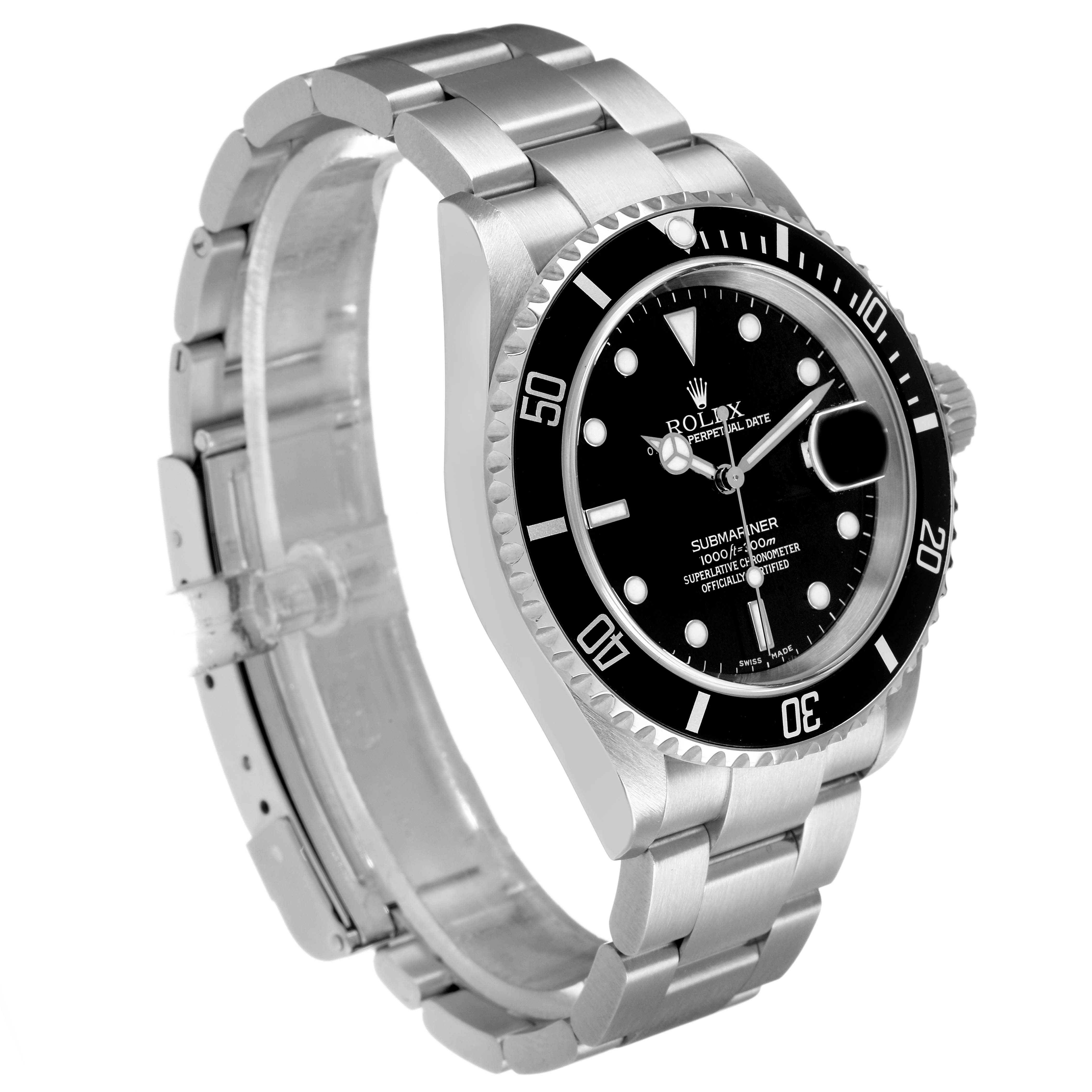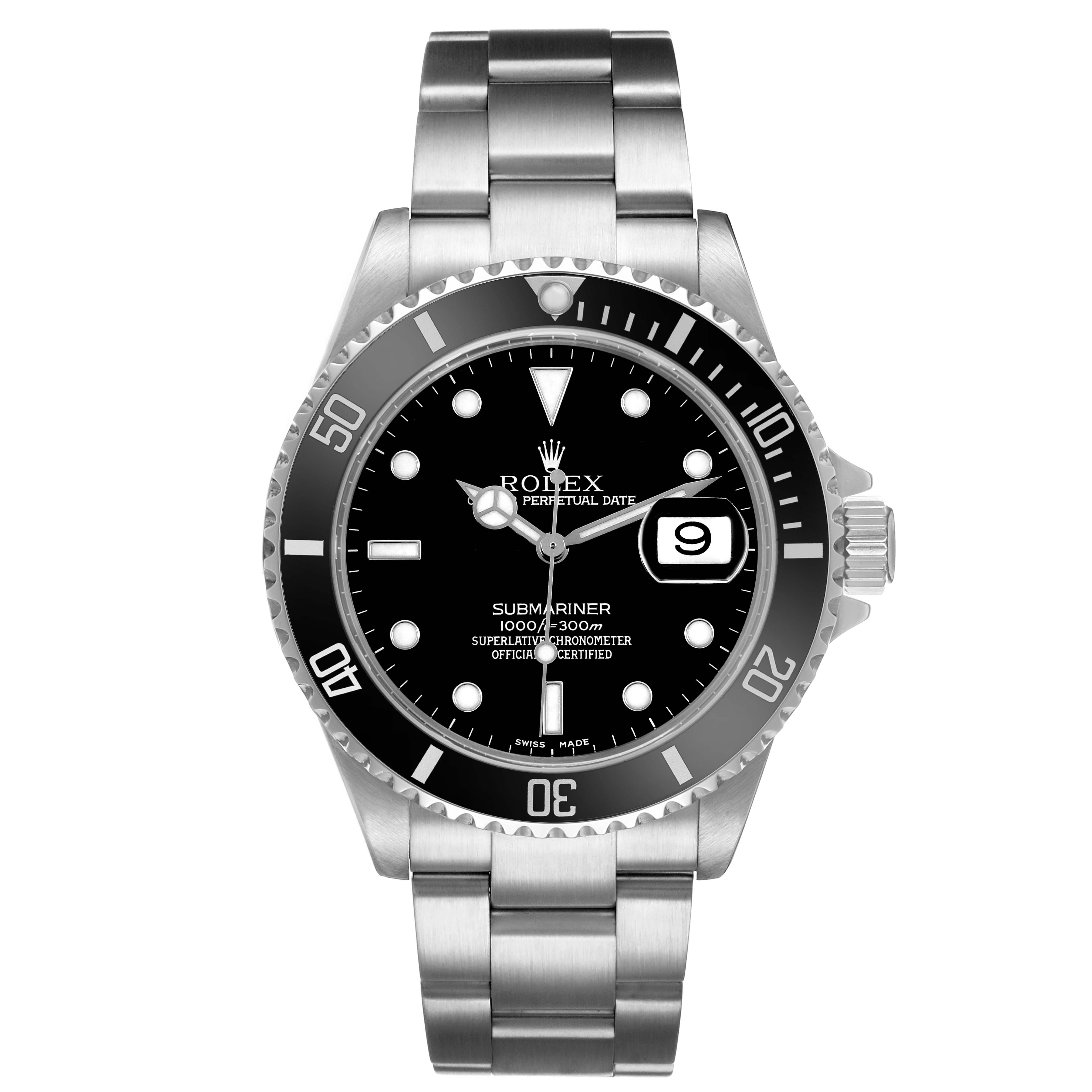 Rolex Submariner Date Steel Black Dial Mens Watch 16610. Officially certified chronometer automatic self-winding movement. Stainless steel oyster case 40.0 mm in diameter. Pointed crown guards. Rolex logo on the crown. Black unidirectional rotating time-lapse bezel engraved with 60-minute graduation. Stainless steel oyster bracelet with a flip-lock clasp. Fits a 7 1/2" wrist. Black dial with luminescent Mercedes hands and dot hour markers. Date calendar at the 3 o'clock aperture. Outer stick minute markers. Stainless steel oyster bracelet with a flip-lock clasp. Fits a 7 1/2" wrist.