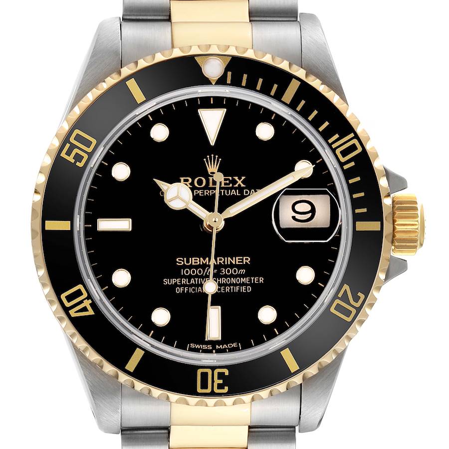 Rolex Submariner Steel Yellow Gold Black Dial Mens Watch 16613 Box Papers. Officially certified chronometer automatic self-winding movement. Stainless steel and 18k yellow gold oyster case 40.0 mm in diameter. Rolex logo on the 18k yellow gold crown. Pointed crown guards. Special time-lapse unidirectional 18k yellow gold rotating bezel with a black insert. Scratch resistant sapphire crystal with a cyclops magnifier. Black dial with luminescent yellow gold-outlined Mercedes hands and dot hour markers. Outer stick minute markers. Date calendar at the 3 o'clock aperture. Stainless steel and 18k yellow gold oyster bracelet with a flip-lock clasp. Fits a 7.5" wrist.