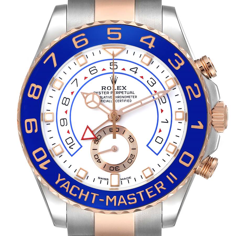 Rolex Yachtmaster II Regatta Steel Rose Gold Mens Watch 116681 Box Card. Officially certified automatic chronometer self-winding movement. Stainless steel and 18K rose gold oyster case 44.0 mm in diameter. Two 18k rose gold pushers operate the chronograph functions. Pointed crown guards. Rolex logo on the 18k rose gold screw-down crown. Blue Ring Command 90-degree rotating 18k rose gold bezel with a blue ceramic top ring. Scratch resistant sapphire crystal. White dial with luminescent baton hands and square rose gold outlined hour markers. Red central chronograph hand. Regatta 1-10 countdown timer with a red arrow-shaped countdown hand. Rose gold outlined 60 seconds subdial at the six o'clock position. Outer stick minute markers. Small seconds subdial at 6 o'clock. Stainless steel and 18K rose gold oyster bracelet with a flip-lock clasp. Fits a 7'' wrist.