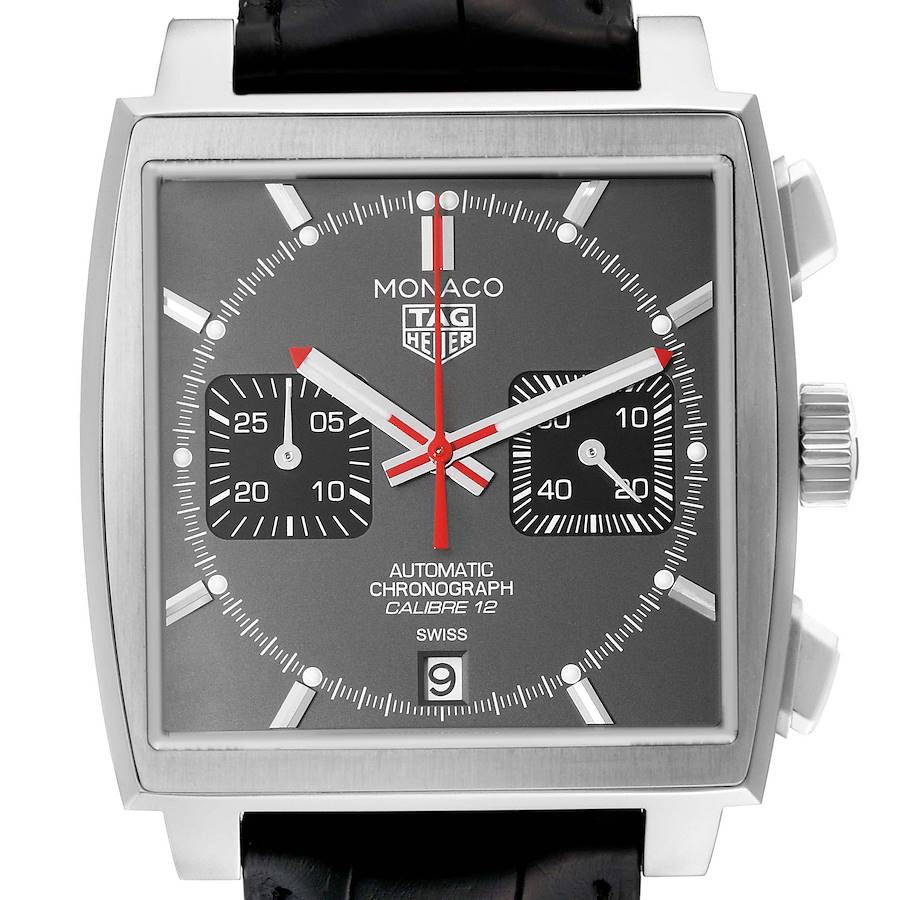 Tag Heuer Monaco Grey Dial Limited Edition Steel Mens Watch CAW211J Box Card. Automatic self-winding chronograph movement. Alternate fine-brushed and polished stainless steel case 39.0 x 39.0 mm. Fluted crown. Exhibition transparent sapphire crystal case back. Stainless steel bezel. Scratch resistant sapphire crystal. Grey dial with with red accents. Raised polished, nickel-plated index hour markers and luminous hands. Date window at 6. Two chronograph sub-dials -- 60 seconds and 30 minutes. Black leather strap with stainless steel deployant buckle.